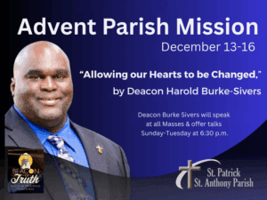 with Deacon Harold Burke Sivers. Deacon Harold will preach at all Masses & speak at 6:30 p.m., Sunday-Tuesday. All are welcome. No registration required.
