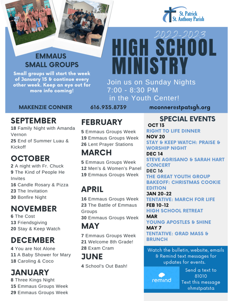 All 9th-12th grade students are invited to the Youth Center on Sundays at 7:00 PM. Please join us as we walk with Jesus and our parish mentors in learning about our faith while sharing spirit-filled discipleship moments with our friends.