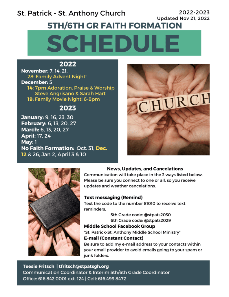 Adult volunteers attend faith formation on a regular basis and can help in various ways. The most common role is that of a small group leader. Small group leaders are assigned to a group of students and facilitate conversation about the topic of the night. Small group leaders are also asked to build meaningful, Christ centered relationships and invest in the lives of the middle schoolers. Other ways adult volunteers can help is by assisting with check-in, arranging and setting up snacks, and lending an extra hand during social activities and events.