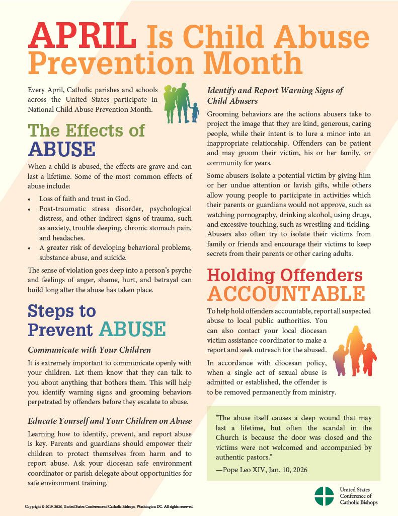 During the month of April, we observe National Child Abuse Prevention Month. At the United States Conference of Catholic Bishops (USCCB), we raise awareness for the protection of children and the prevention of their abuse and neglect. The Secretariat of Child and Youth Protection is dedicated to raising awareness, providing resources to families, and supporting children.